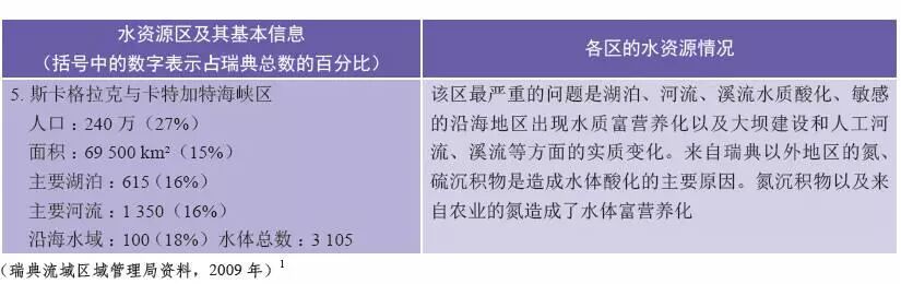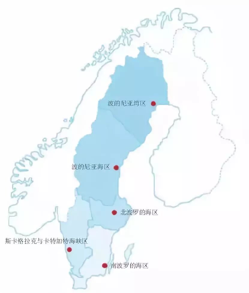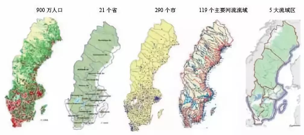 2000年,《欧盟水框架指令》开始实施,欧盟各成员国的水资源管理工作的开展更协调、更统一。自2004年起,为了更有效地管理水环境,瑞典被划分为五大水资源区(如图1、2所示),每个区包含多个江河流域。瑞典总共有119个主要的江河流域,这些流域是地方水资源管理工作的起点。这五大水资源区是按照它们与海床的地理区域关系划分的,这些海床包括:波的尼亚湾区、波的尼亚海区、北波罗的海区、南波罗的海区、斯卡格拉克与卡特加特海峡区等。此后瑞典在五大水资源区开展水资源管理工作。