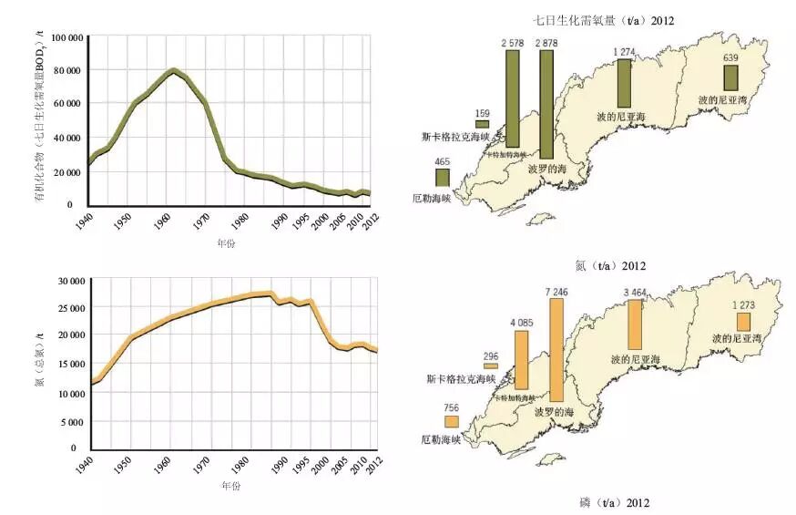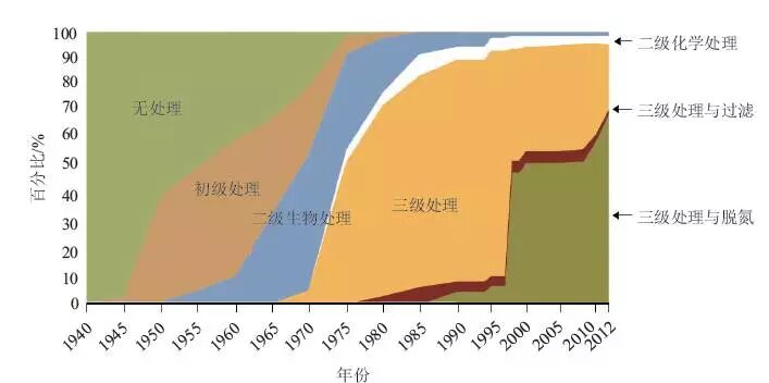 如今,瑞典所有城市家庭的污水在排放到自然之中之前都得到了处理。超过95%的家庭污水都经过生物和化学处理。地处城市地区以外的约70万个家庭拥有小型污水处理系统。与拥有自己专门的污水处理厂的工业源水排放相比,城市地区以外的家庭所排出的这些小规模且零散的营养物质,是瑞典湖泊、河流、沿海水域的富营养化问题更重要的原因。瑞典污水处理问题的历史发展如下图所示。